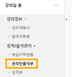 - 강의실 → 왼쪽 메뉴 → 온라인 출석부